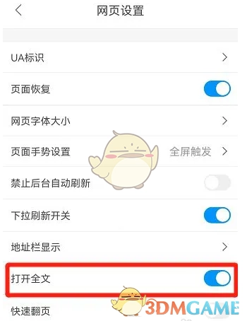 4、进入网页设置页面,开启“打开全文”后的开关,操作如下所示: (此处可添加“如下图”并配上对应图片,如果有相关需求的话)