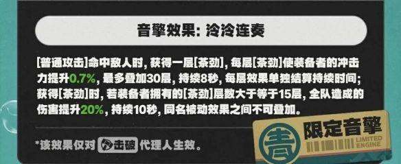 当获取[茶劲]时,若装备者所拥有的[茶劲]层数≥15层,全队造成的伤害提高20%,此效果持续10秒,且同名被动效果无法叠加。