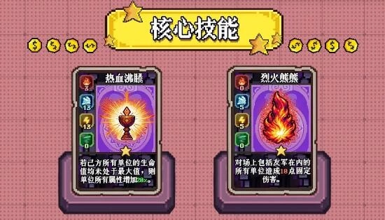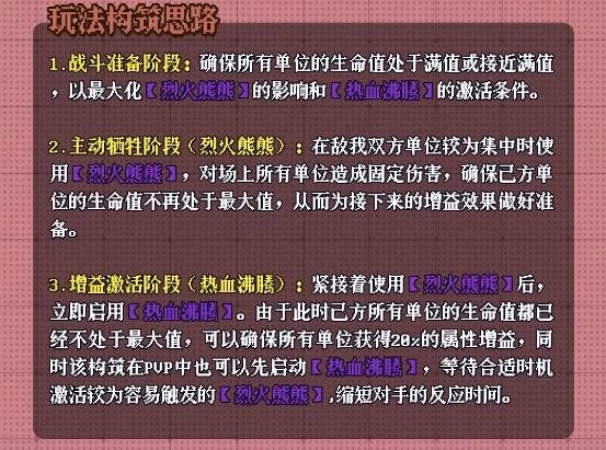 紧接着施展【烈火熊熊】之后,即刻开启【热血沸腾】。鉴于此刻己方所有单位的生命值均未处于最大值状态,能够保证所有单位获取20%的属性增益。此外,在PVP场景下,该构筑还可先发动【热血沸腾】,等待恰当的时机再激活相对容易触发的【烈火熊熊】,以此来缩短对手的反应时长。