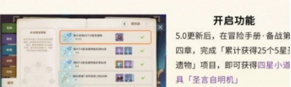 2、5.0版本更新之后,于冒险手册·备战第四章里达成[累计获取25个5星圣遗物]这一任务,就能得到圣言自明机。