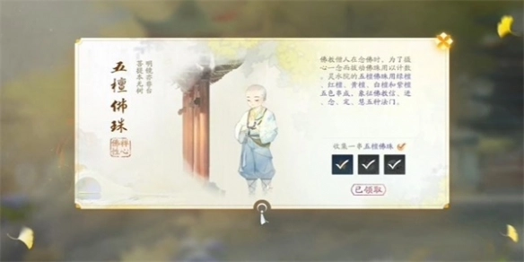 4、待所有对话结束,我们便能成功收集到五檀佛珠。