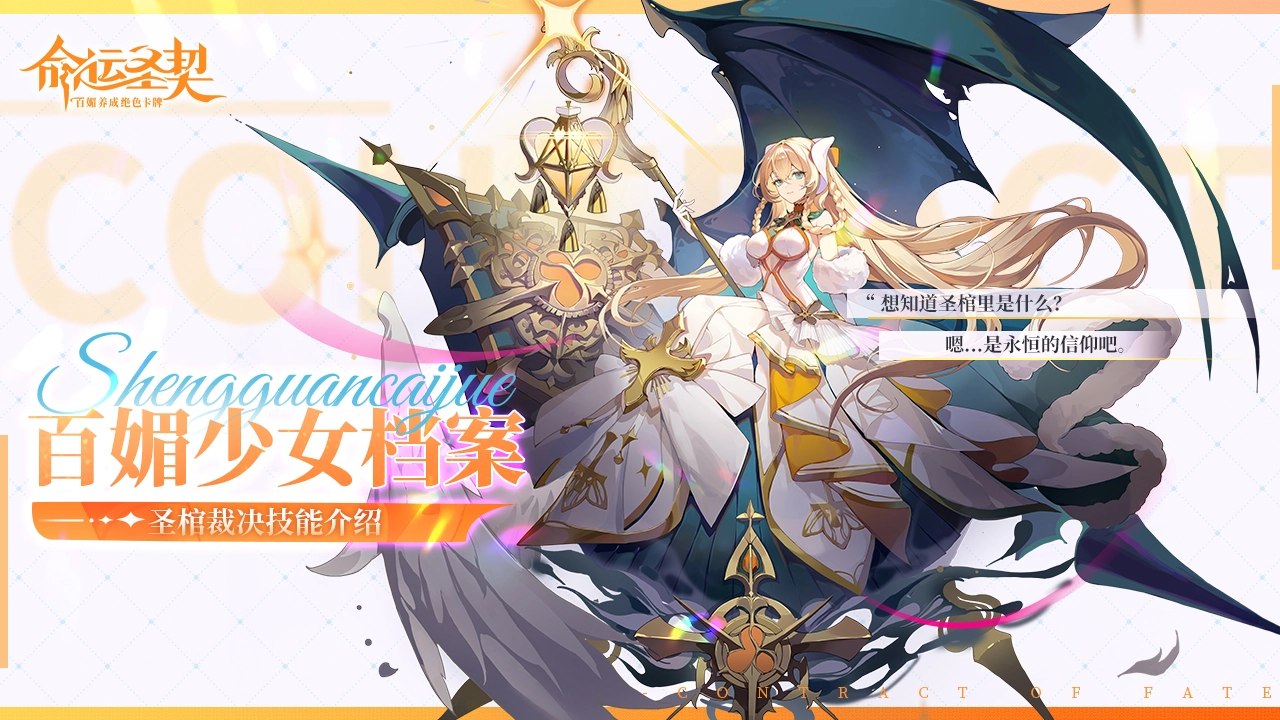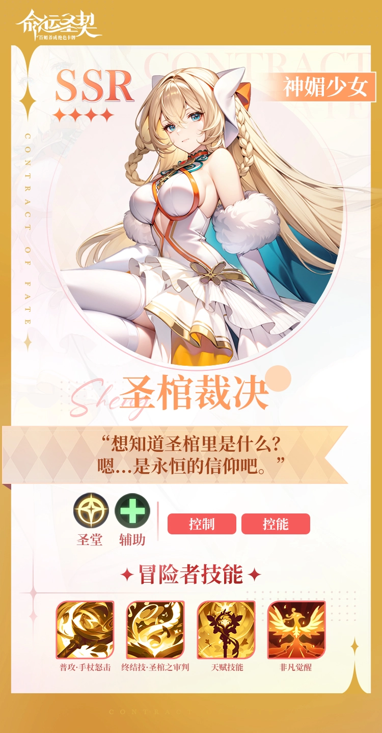 在《命运圣契》里,神媚少女·圣棺裁决身为光境审判官,同时也是凡人灵魂归途中的引渡者。她外表庄严圣洁,内心却满是怜悯。在她跟前,人的善恶无所遁形,然而,只要愿意悔悟罪过,就能够向她祈求恩泽,以此洗刷灵魂所沾染的罪孽。那么,她究竟拥有哪些技能呢?接下来,就由小编为大家呈上详细的《命运圣契》神媚少女·圣棺裁决技能攻略。