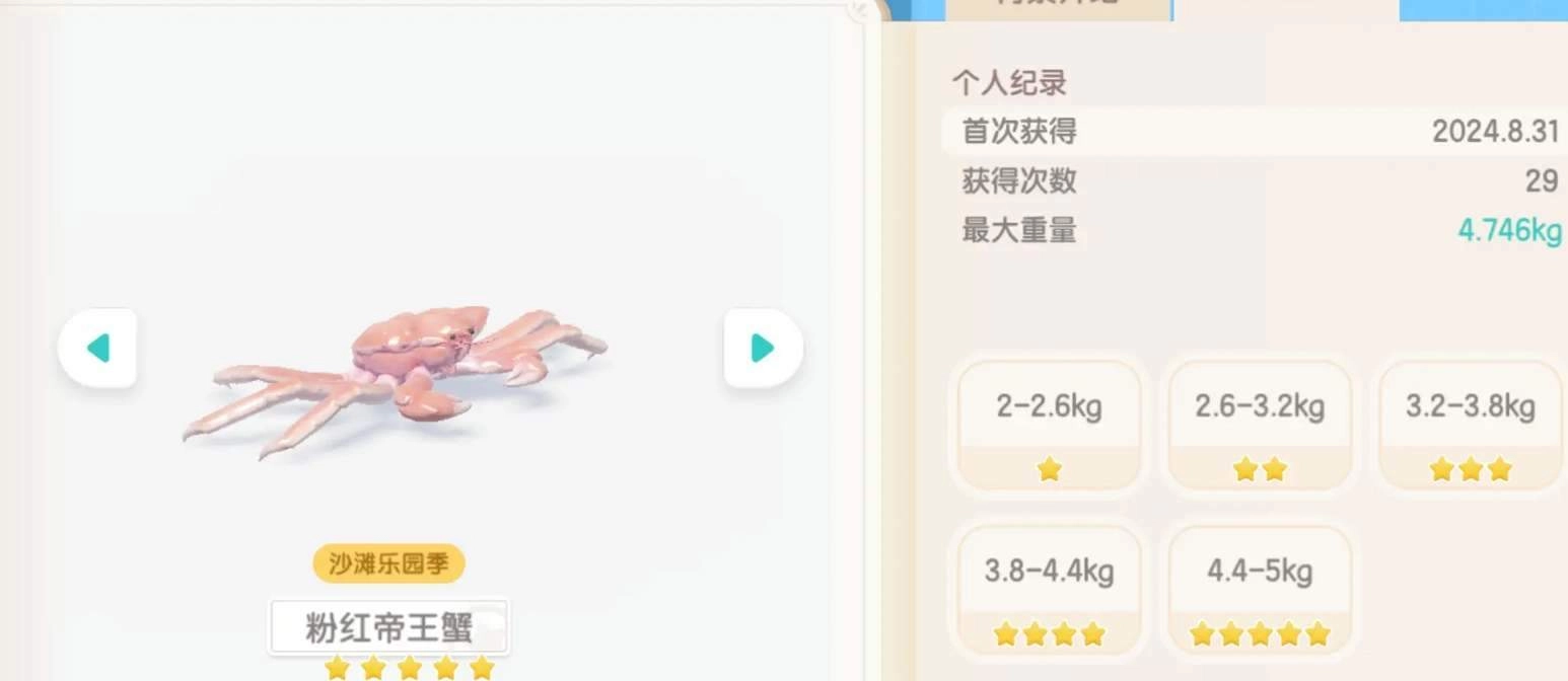 粉色帝王蟹仅在沙滩季事件中能够碰到,必须在彩虹天进行垂钓。