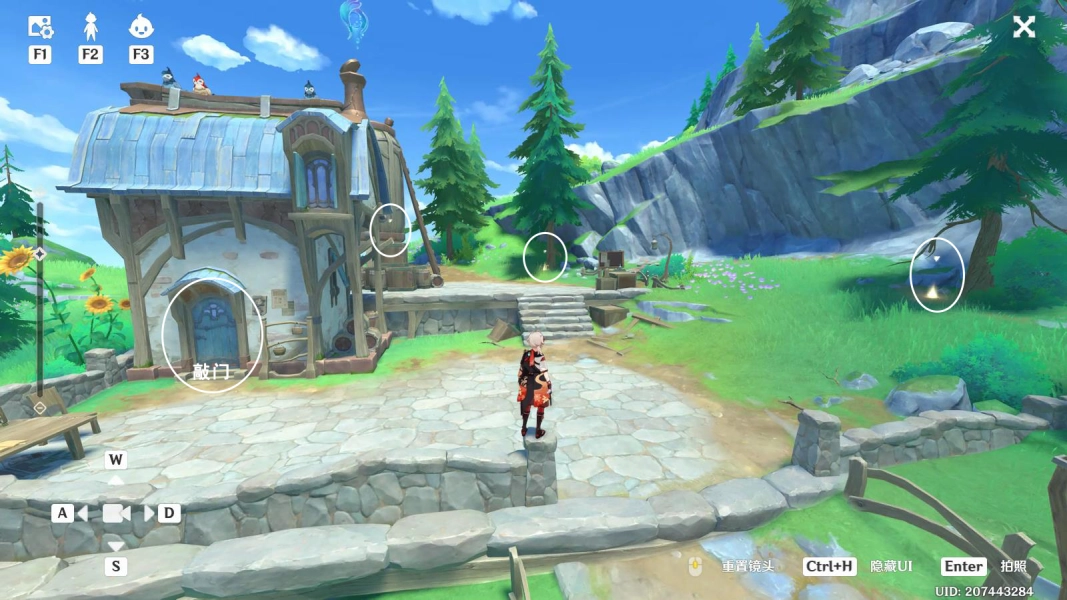 2、接下来要对下图标记的三个地方展开调查,之后前往小屋敲门,紧接着要通过小屋设置的测验。