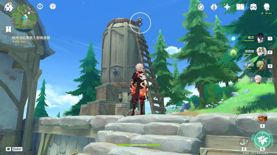 4、接下来再次与小屋交谈,交谈完毕后,要去寻找小屋后方传来的说话声,找到后,玩家需把松果放置到坩埚的顶部。