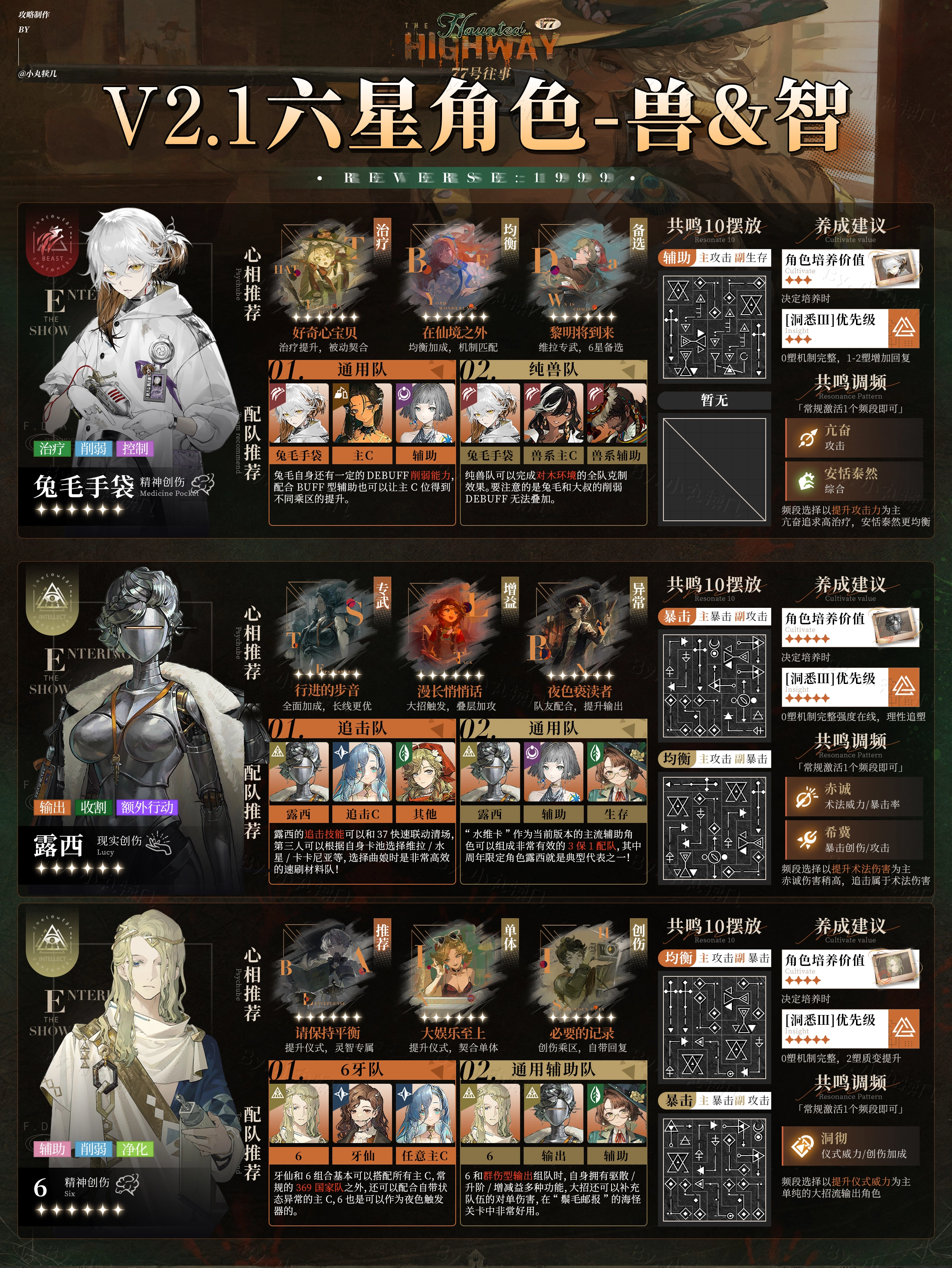 今天为大家呈上《重返未来:1999》V2.1全6星角色一图流养成攻略!下面便是优化后的全角色一图流攻略<重返未来1999 V2.1版本 - 77号往事>『全6星角色一图流』养成攻略,角色依照[木->灵->兽->智->岩->星]的顺序排列。各位若想知晓详情,不妨来瞧一瞧!