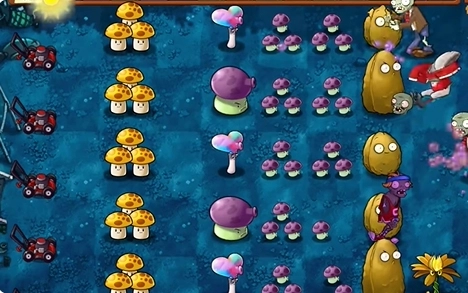 2. 首先在左侧第二列合成四格阳光菇,接着在中间种下一个食人花。