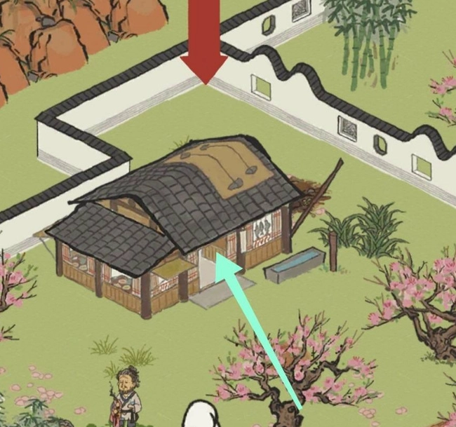 1、于桃花坞副本里,在图中所示的位置寻觅到店铺。