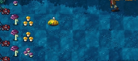 3、在一列的左侧补种胆小菇与阳光菇,于外侧种下两个大喷菇,接着把寒冰菇种在大喷菇的位置。