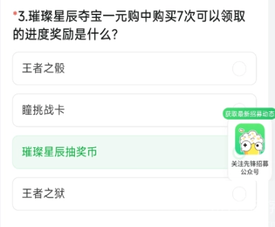 3、在璀璨星辰夺宝一元购里,购买7次能够领取的进度奖励是什么?答案是:璀璨星辰抽奖币。