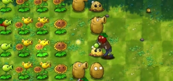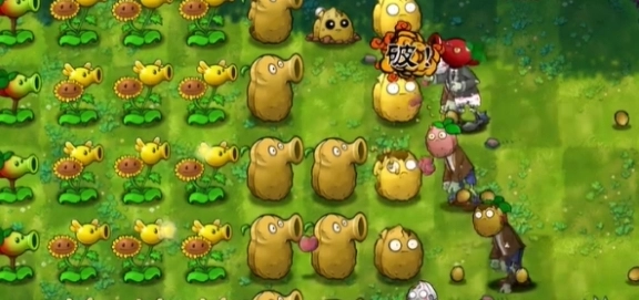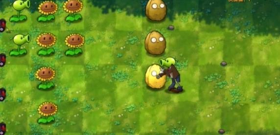 3、接着在左边继续种上好几株向日葵,把豌豆种到右边的坚果上面。