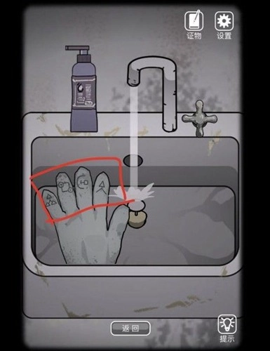 前往右侧空间的西药房,拾起地上的线索【报纸】。接着来到厕所,进入后点击左侧水池,打开水龙头,放入洗剂,再把手套放进去。这时会显示出电梯旁工具箱的密码。