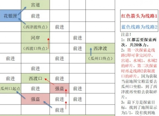 1. 渡口行程:先前进,接着继续前进,然后击败强盗,抵达西渡口,再前进,再次击败强盗,来到瓜洲口起点,之后前往西津渡,获取花银匣,最后到达宫道。