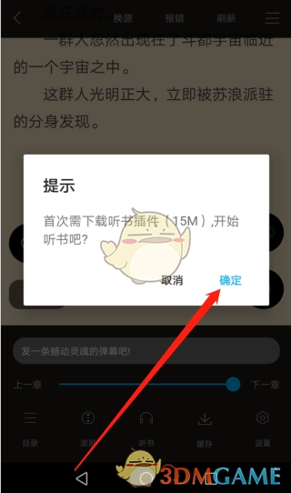 4、此时系统会提示,需下载听书插件方可进行听书,我们找到“确定”按钮并点击。
