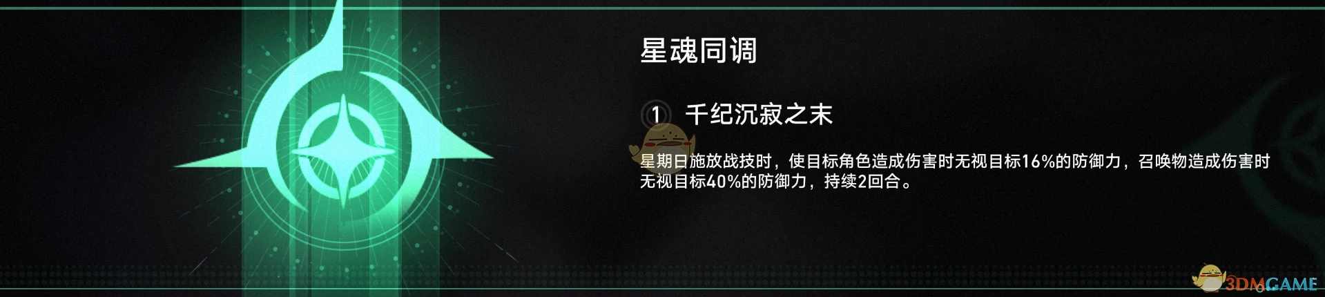 2、2魂效果:首次释放终结技时,会额外获得2个战技点。这不仅能缓解队伍在使用战技资源方面的压力,还能显著优化后续战技的覆盖范围。与此同时,还会为增益目标额外提供30%的增伤效果。