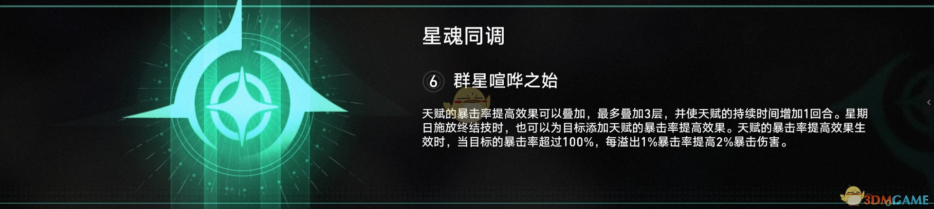 4、6魂效果:天赋的暴击效果能够叠加3层,这意味着可获得最高60%的暴击收益。同时,其持续时间延长到4回合,而且对终结技增益的目标同样能附加天赋的暴击加成。要是目标当前暴击率超过100%,那么会按照1:2的比例转换为暴伤收益。双暴的提升,让主c有着充足且稳定的输出表现。