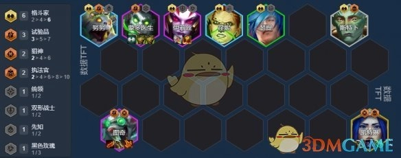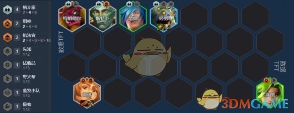 3要是3-2阶段过后还没进行阵容转型,那就只考虑升到7级,在7级时慢慢搜牌,争取追出三星努努。7级时按照下面的阵容配置来上场英雄,此时需要上阵老鼠来补充伤害,让努努和老鼠站在试验格上。