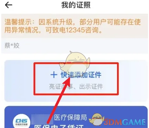 2、接下来进入“我的证照”页面,点击“快速添加证件”。