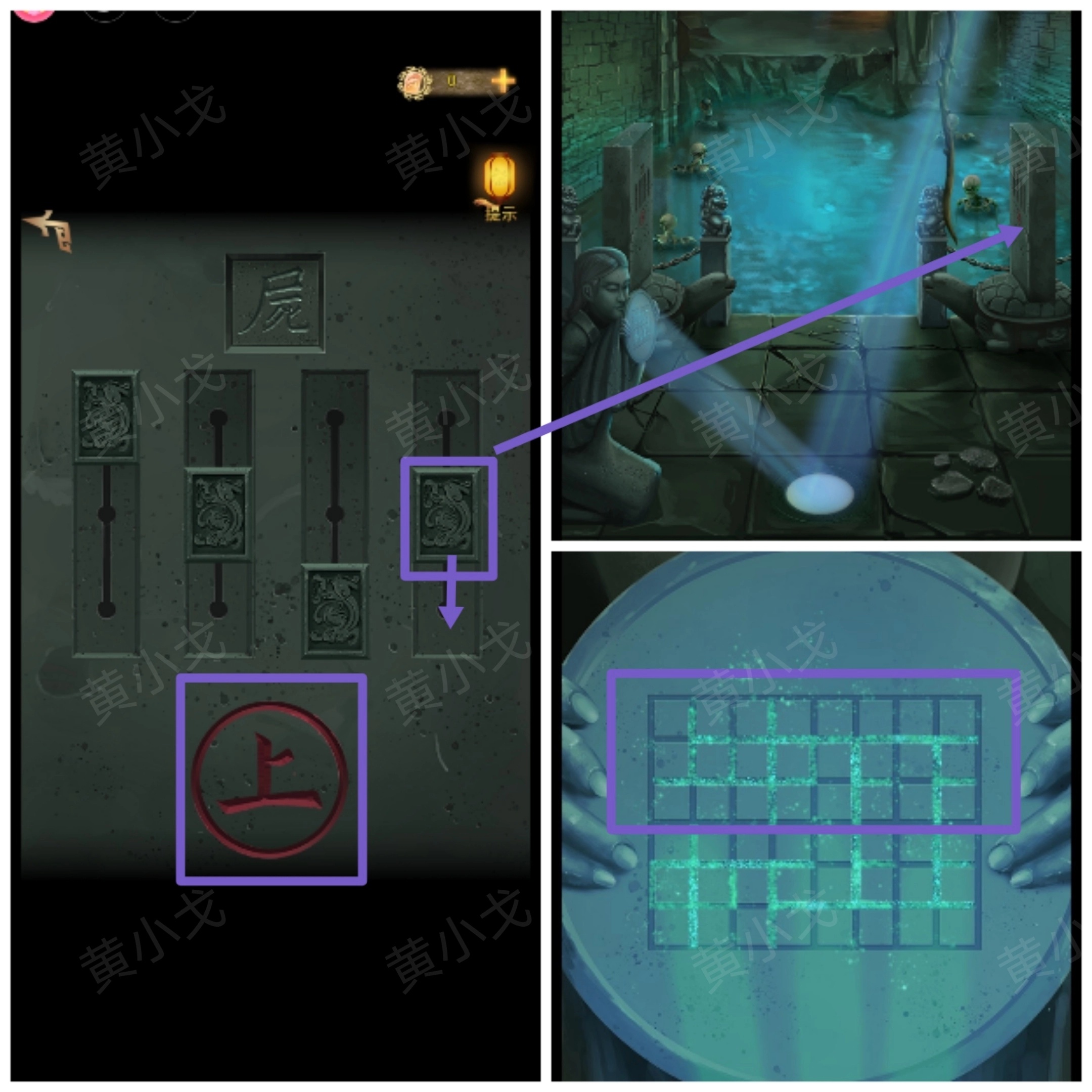 轻触右侧的石碑,依据石碑上所提示的“上字”以及石镜呈现的线索,对滑块的位置进行调整。