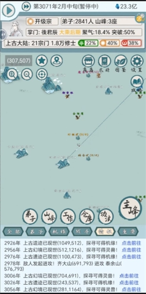 前期先刷高境界,接着逐步攻打数量不超过3个的无主山峰,随后慢慢替换为攻打3个大型山峰(要是超过3个就会遭到攻击)。同时,要把灵脉之类的全部提升到满值,注意不要去攻打矿脉等招惹有宗门势力的人机,就这样一直发展,直到拥有大乘修士(在这个过程中可以开启凝气阵来加快修炼速度)。另外,上古幻境一定不能错过,对于用不着的高境界修士,可以安排他们去进行采集和探索。