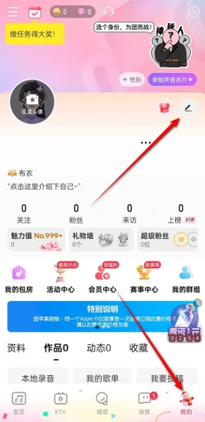 1. 进入唱吧,切换至“我的”页面,点击编辑小图标即可进入。