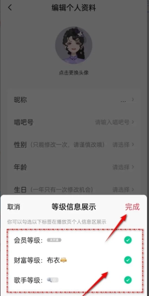 3、点击就能勾选设置展示“会员等级”“财富等级”或者“歌手等级”,点击即可“完成”设置。