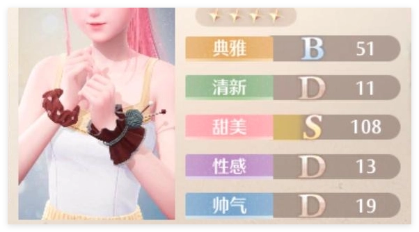 焕新后的评分如下:典雅 5844,清新 1695,甜美 11876,性感 1497,帅气 1695。