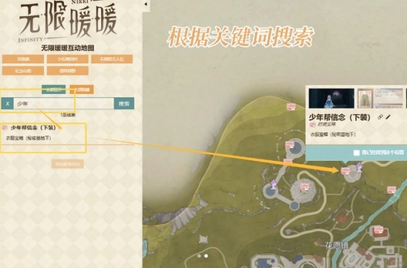 例如有一件时装,表明是从大世界宝箱获取的。那么就能借助关键词搜索,迅速找到具体是哪一个时装宝箱。举个例子,有一款下装名为“少年帮的信念”,它源自大世界的宝箱。在左侧搜索框输入“少年帮”【支持部分关键词搜索】,就能看到对应的点位,点击之后便知晓其在地图上的位置。