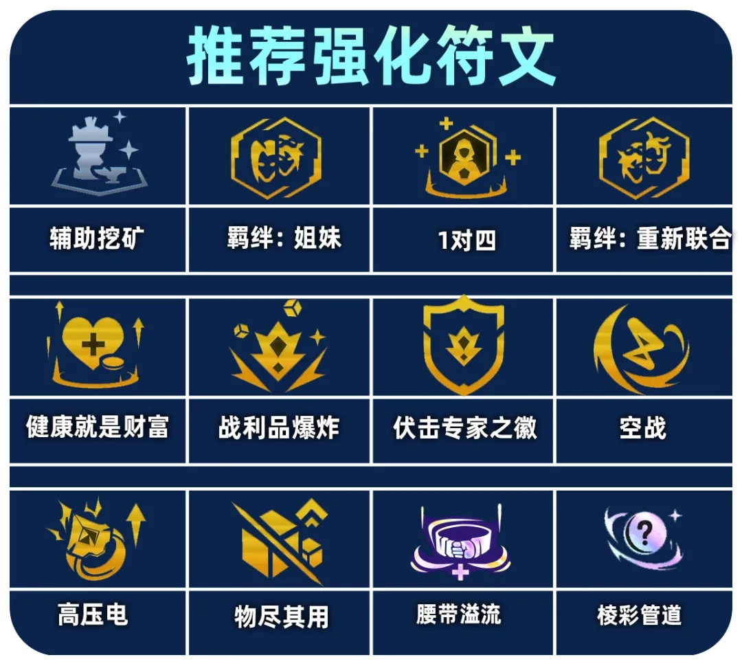 8在8级时,优先开出5伏击。在金克丝到来之前,可以先用二星蔚、一星女警或者洛里斯。升至9级后,通过搜卡(D牌)找到金克丝和女警,以此组成标准阵容。要是拿到了海克斯强化“重新联合”或者“姐妹”,那就带上蔚。