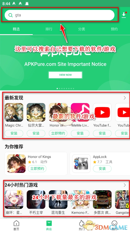 1. 下载并安装APKPure,安装完成后打开该软件,其基本功能呈现如下图示。