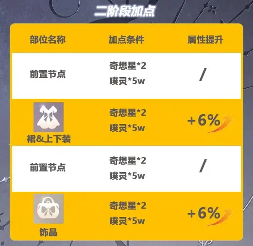 第二阶段:持续进行均衡加点,在解锁前置节点之后,优先增强裙装、上下装以及饰品的能力。