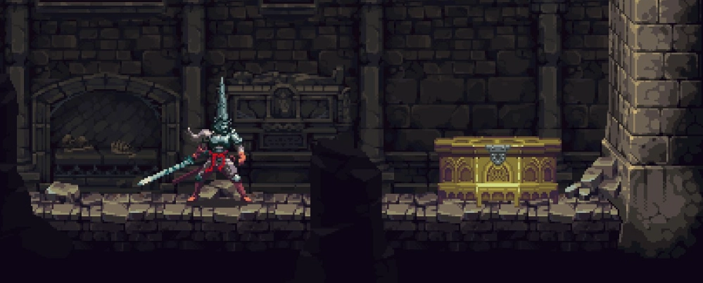 ⑦从商店出来,前往对面的门。沿着路线一直走到尽头,接着往下走,你会瞧见一面带有烛台的墙,像往常一样上前攻击墙面,打开隐藏房间。