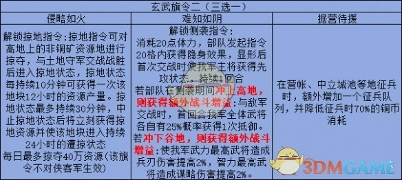 难知如阴般的旗令,于20格范围内能隐身推进,首战之时主将优先攻击,并且在高地与谷地还具备额外效果。此乃专为大规模山地战打造,比拼的正是人多所带来的概率优势,投入使用的人数越多,其威力越强。可应用于某些战略争夺区域的偷袭行动。建议点亮。