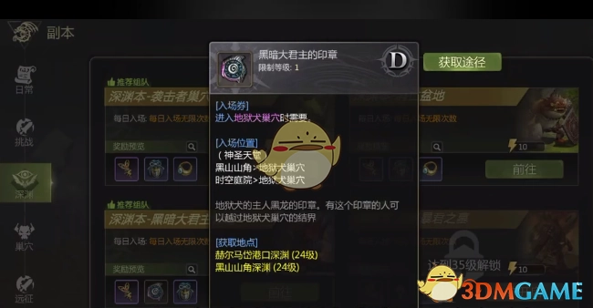 通常在达到32级后获取的疲劳值,便能够用于进入地狱犬巢穴。不过,若想进入巢穴并拿到门票,就一定要战胜黑暗大君主。要是还有多余的疲劳值,就可以去挑战细缝。