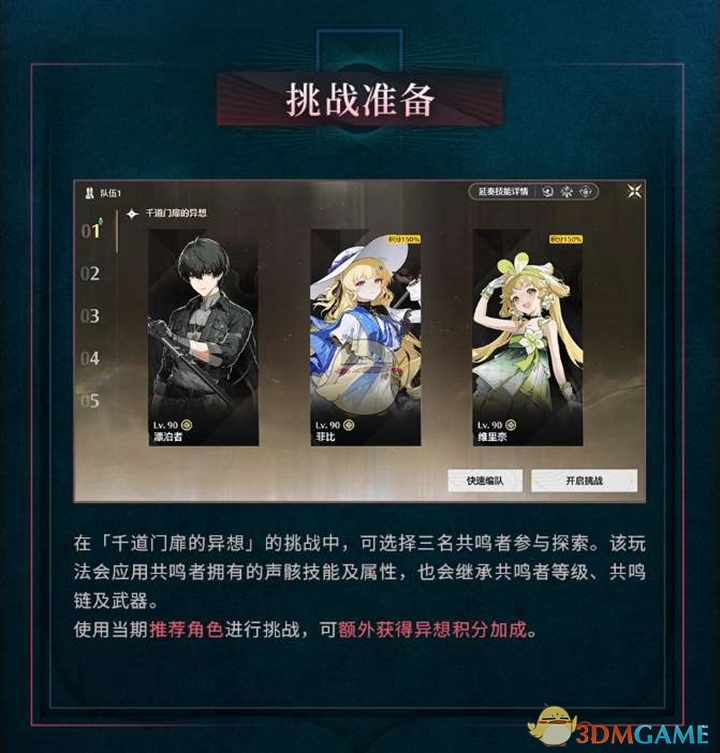 在迎接挑战之前,玩家能够从自身所拥有的共鸣者里选取三名来参与探索。这些角色的声骸技能、属性,以及等级、共鸣链与武器等方面,均会对挑战的最终效果产生影响。若玩家选用当期所推荐的角色展开挑战,还可额外获取异想积分加成。