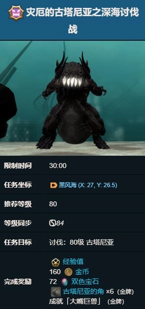 1、玩家首先要完成黑风海80级危命任务【灾厄的古塔尼亚之深海讨伐战】,从而获取【古塔尼亚的角】。