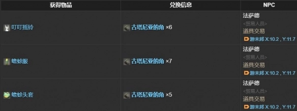 4、“古塔尼亚的角”能够用于兑换以下物品:叮叮摇铃、蟾蜍服以及蟾蜍头套。