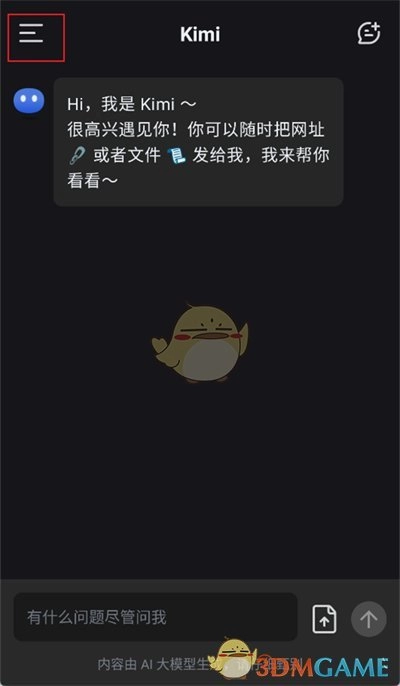 1、第一步,打开kimi智能助手app,进入软件界面后,点击左上角的【三】图标。