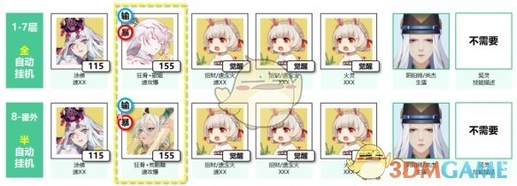 备注2:8层 - 番外开局需手动操作:先让千姬插锤,接着苍连把第一个盾给鲤鱼精,随后清姬小美进行控制,大缘使用2技能并选择红色结缘给鲤鱼精。完成这些步骤后切换为自动模式,红标敌方主怪,苍连锁定2技能,其余角色妖术设为自动。借助大缘的AI自动结缘鲤鱼精,使其能够多次行动,从而尽快解救河童。在此之前,依靠苍连的AI为全队补充减伤盾,保护全队,再配合晴明的生盾,达到如同铜墙铁壁般的防御效果。
