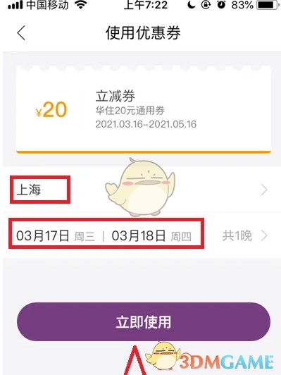 5、接下来挑选入住地点与时间,点击【立即使用】,最终选定要入住的酒店就行。