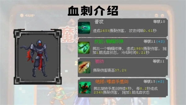 血刺就是平民零氪玩家第二个救星了,虽然说没有比火岚出色,但是比骑士和森林游侠好一些,血刺这个英雄主要就是要看25次广告才能拿到,所以前期一定要先看完25次广告拿到血刺,这样前期的关卡随便打!