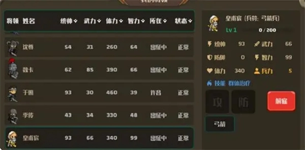 统帅:初始最高值为99,对战场阵型主将加成、旗下士兵战力有影响。