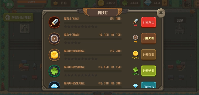 士兵防御科技:等级上限为5级,每提升一级,防御增加1点。