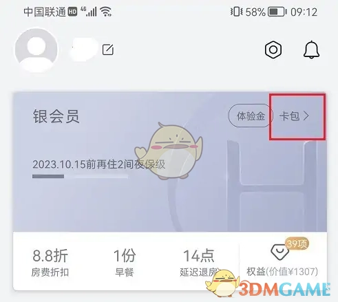 1. 进入华住会“我的”界面后,点击右侧的卡包。