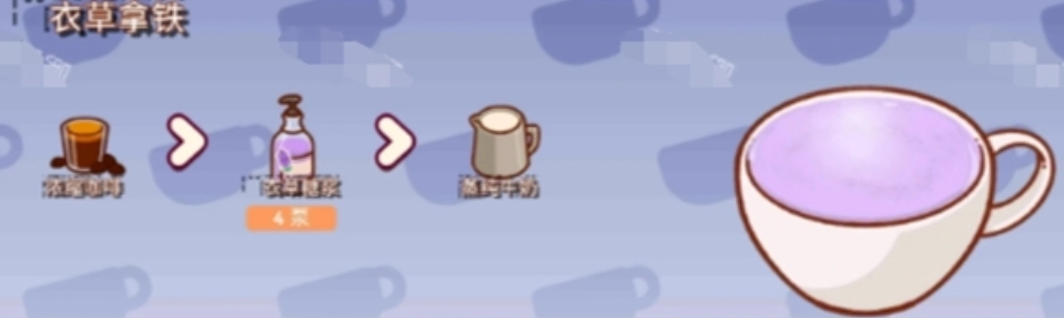 若顾客点单冰薰衣草拿铁,玩家直接把事先备好的两勺冰块、薰衣草糖浆、蒸纯牛奶与浓缩咖啡,一同放入玻璃杯中,接着搅拌均匀。