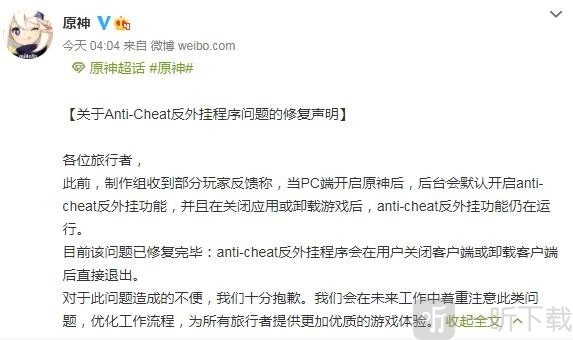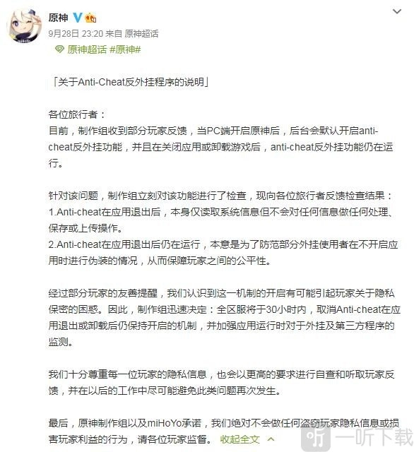 在部分玩家的友善提醒下,我们意识到开启这一机制可能会让玩家对隐私保密产生困惑。于是,制作组当即决定:全区服会在30小时内,取消Anti - cheat在应用退出或卸载后依旧保持开启的机制,同时强化应用运行期间对外挂及第三方程序的监测。