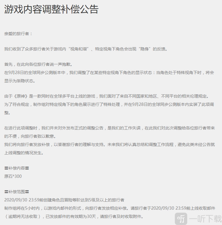制作组会在5小时之内,通过游戏内邮件的方式,给旅行者发放对应的补偿。请旅行者在2020年9月30日23:59之前上线收取邮件(超过此时间将无法收取),已发出邮件的有效时长是30天,还请旅行者尽快收取附件。