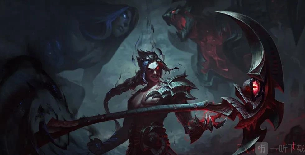 (Q技能)巨镰横扫:凯隐朝着距离最近的一组敌人突进,挥动镰刀对圆形区域内的敌人造成魔法伤害,同时让被命中敌人的蓝量消耗提高33%;若镰刀的斜线恰好命中某个目标,那么凯隐能够再次施展该技能。