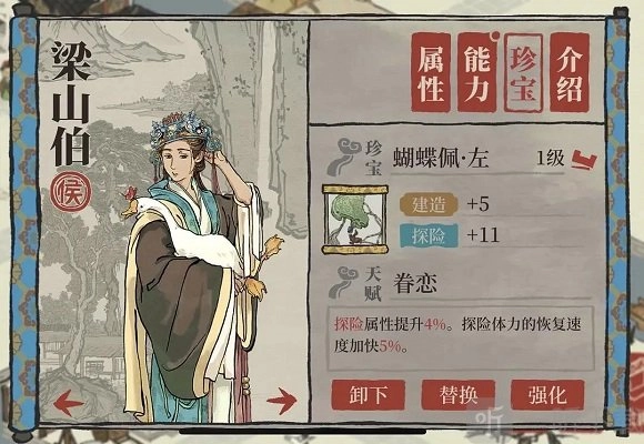 在《江南百景图》里,梁山伯的珍宝该如何搭配?七夕新入住的角色梁山伯,要怎样选择与之适配的珍宝呢?还有蝴蝶佩左的属性要怎么运用呢?下面,小编整理了《江南百景图》中梁山伯的珍宝搭配方法,大家一起来看看详细的内容介绍吧!