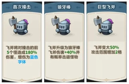 提升骑士的飞斧伤害、攻击范围以及击退怪物,保护城墙血量健康。